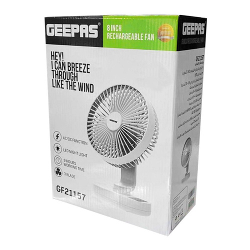 پنکه شارژی جیپاس مدل GF21157 یک محصول بسیار کاربردی از برند محبوب جیپاس می باشید که با توجه به قدرت پرتاب فوق العاده و طول عمر باتری بسیار مناسب آن را به یکی از بهترین گزینه ها برای استفاده در منزل و محل کار تبدیل کرده . موتور پرقدرت ، کم صدا و کم مصرف به همراه 3 گره پلاستیکی اجزای تشکیل دهنده دمنده این محصول می باشند . پایه نگهدارنده امکان تغیر زاویه پرتاب در حالت عمودی را دارد . بر روی پنل جلوی دستگاه صفحه کمترل تعبیه شده که امکان تنظیم سرعت پرتاب در 3 حالت و همچنین کنترل چراغ LED را فراهم آورده . چراغ LED این دستگاه نور ملایمی را فراهم میکند که تا 18 ساعت با هر بار شارژ کار میکند . طول عمر باتری های دستگاه در هر بار شارژ کامل با توجه به سرعت دستگاه در حالت کم سرعت 8 الی 9 ساعت ، در حالت متوسط 4 ساعت و در حالت تند 2 و نیم ساعت می باشد . این پنکه بغیر از حالت شارژی امکان کار در حالت اتصال شارژ مستقیم را نیز دارد.